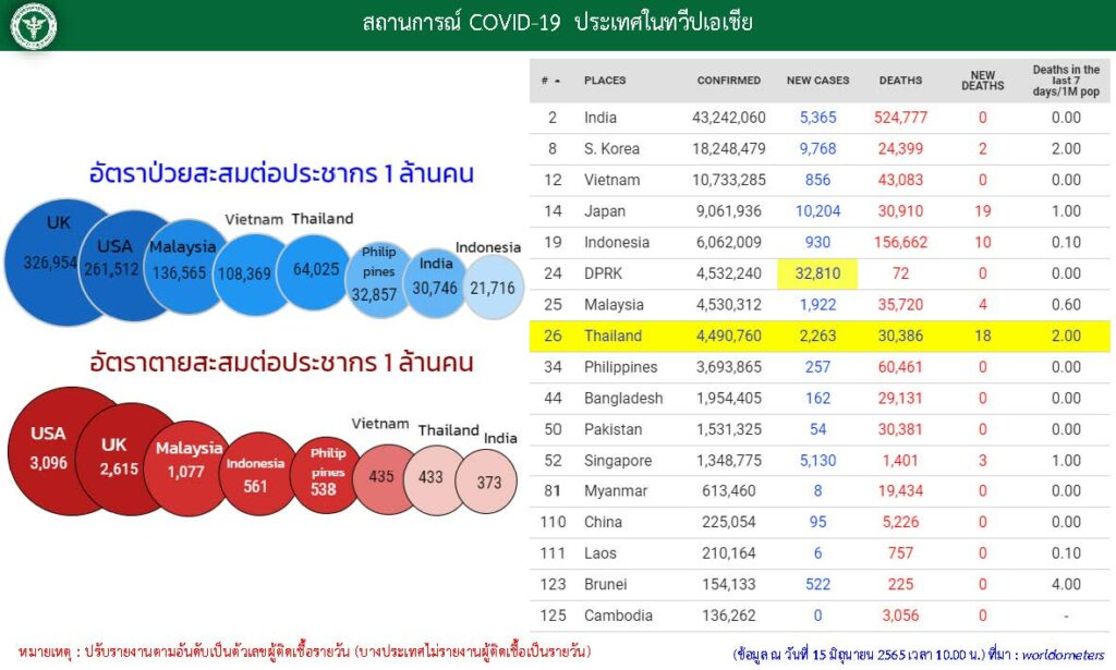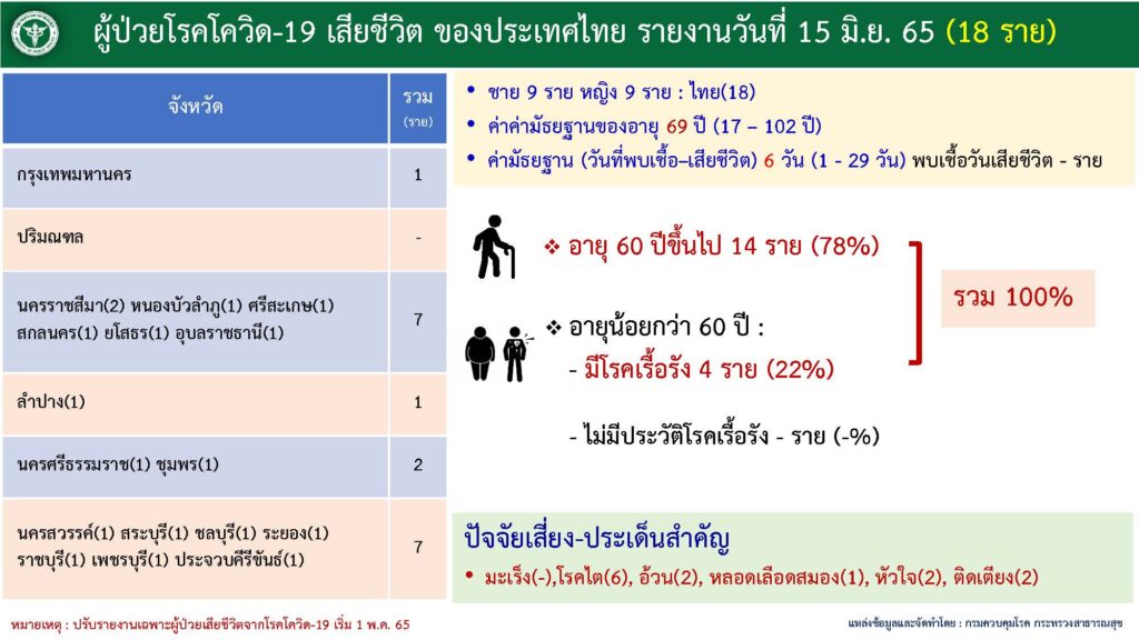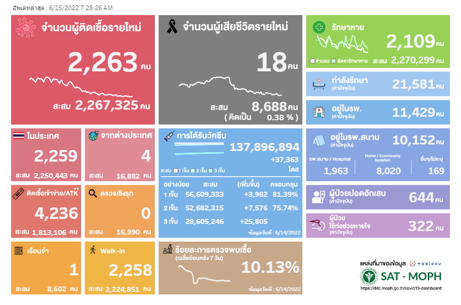 วันที่ 15 มิถุนายน 2565 : ผู้ติดเชื้อ 2,263 ราย : เสียชีวิต 18 ราย