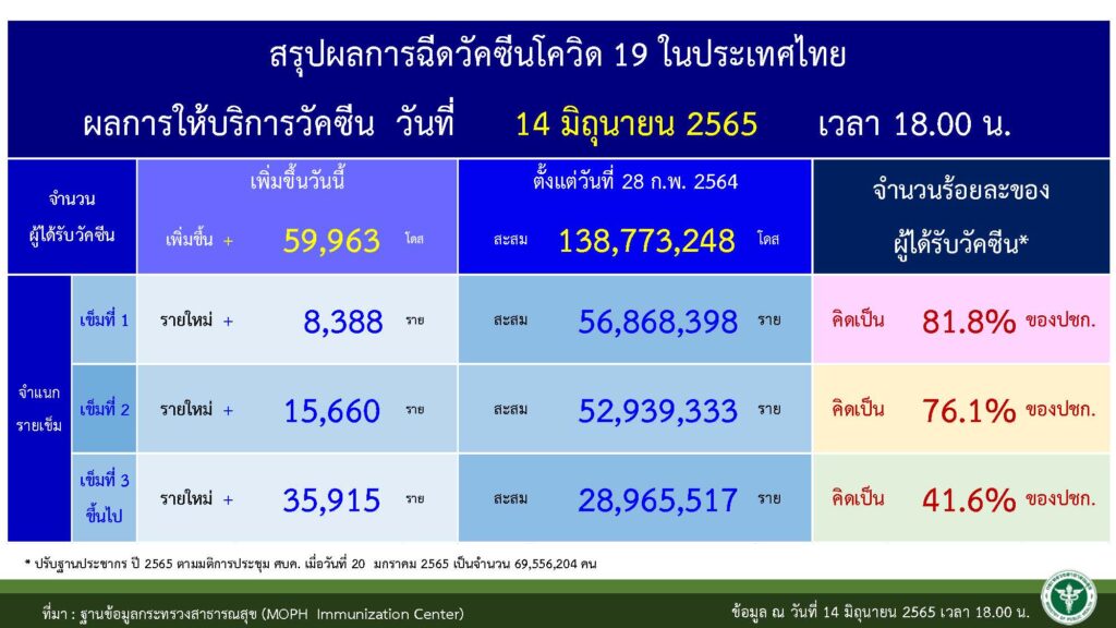 สำหรับผู้มารับวัคซีน ณ วันที่ 14 มิถุนายน 2565 มีผู้รับการฉีดวัคซีน เข็มที่ 1 จำนวน 8,388 ราย เข็มที่ 2 จำนวน 15,660 ราย และเข็มที่ 3 จำนวน 35,915 ราย และระหว่างวันที่ 28 กุมภาพันธ์ 2564 – 14 มิถุนายน 2565 มีผู้รับวัคซีน สะสมทั้งหมด จำนวน 138,773,248 โดสจำนวนผู้ได้รับวัคซีน เข็มที่ 1 สะสม : 56,868,398 ราย