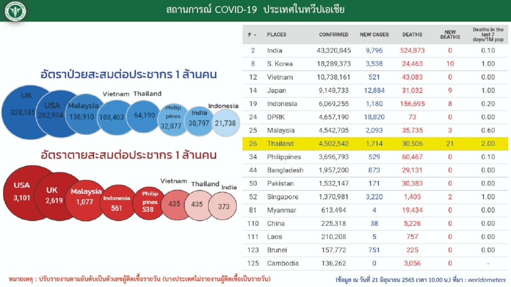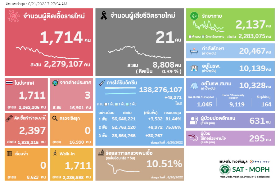วันที่ 21 มิถุนายน 2565 : ผู้ติดเชื้อ 1,714 ราย : เสียชีวิต 21 ราย
